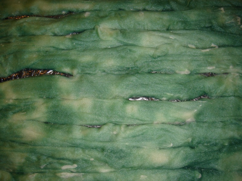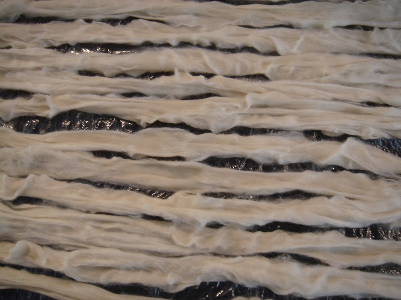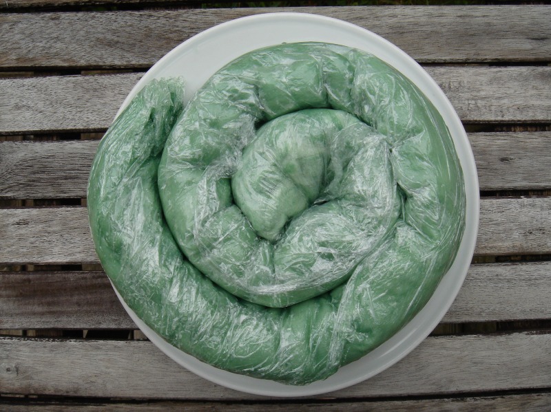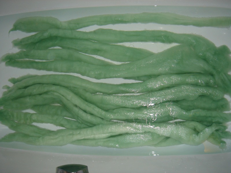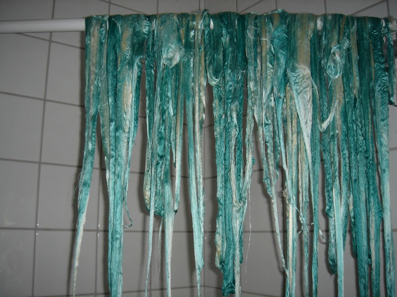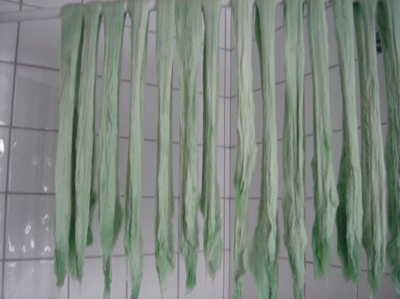 Hier hab ich Tussahseide mit Ostereierkaltfarben gefärbt (mit einem Schuss Essig). Danach hab ich die Seide noch bei 80 Grad eine Stunde lang ins Backrohr gelegt. Vielleicht hält die Farbe dann besser, hab ich mir gedacht. Ich bin schon sehr neugierig, wie sie versponnen aussehen wird. Ich werde sie dann mit der hellgrünen Merino verzwirnen.