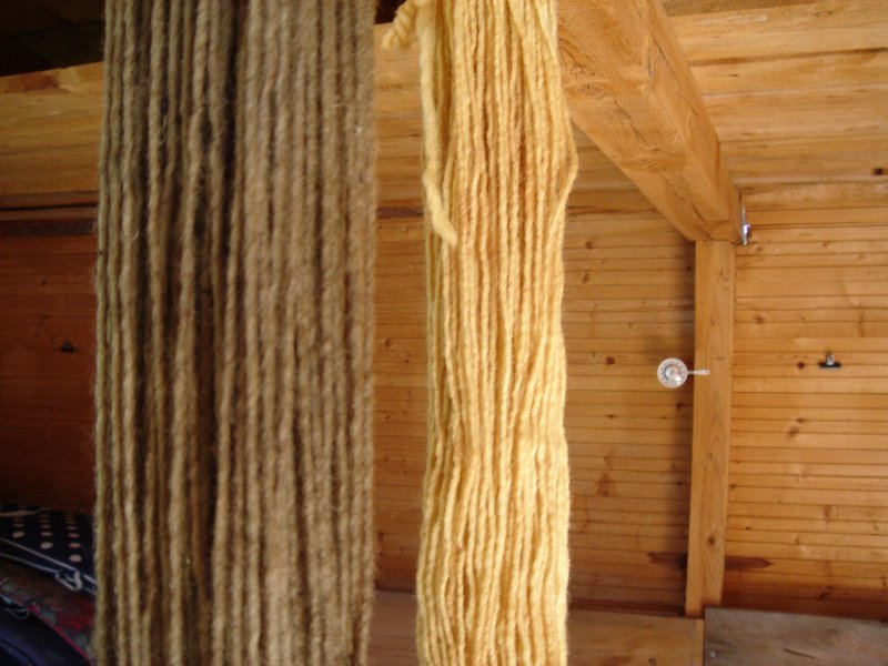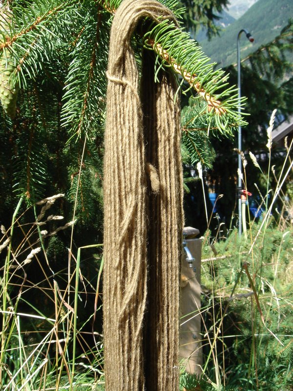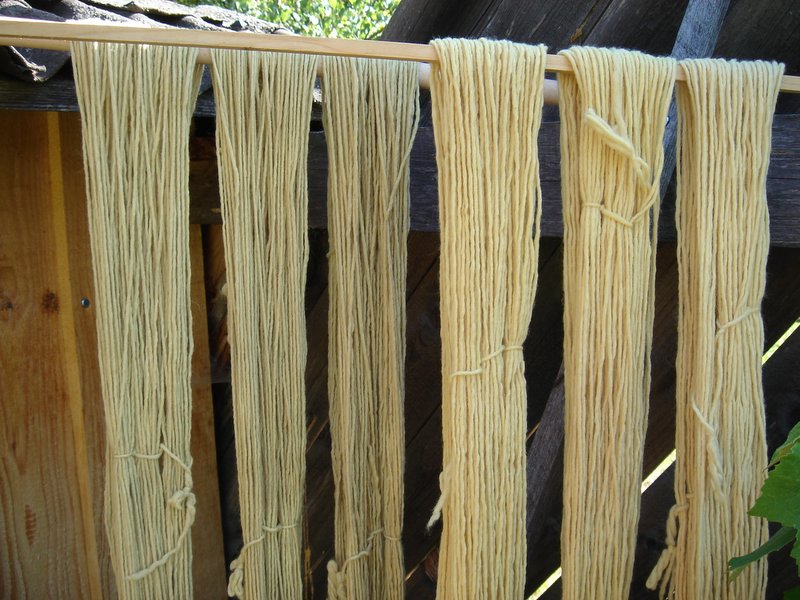 Leider ist die Färbung mit Heidekraut nicht wie erwartet ausgefallen. Ich hätte jeweils drei verschiedene Gelb- und Grüntöne erwartet, herausgekommen ist ein fast einheitliches Gelb, dasselbe in Grün und noch dazu unterscheidet sich das Grün kaum vom Gelb. Selbst wenn man das Foto anklickt wirds nicht besser! Daraufhin hab ich mir gleich Henna, Sandelholz, Alkanna und Cochenille bestellt – das wird dann ein Farbenfest geben! Hoffe ich zumindest.