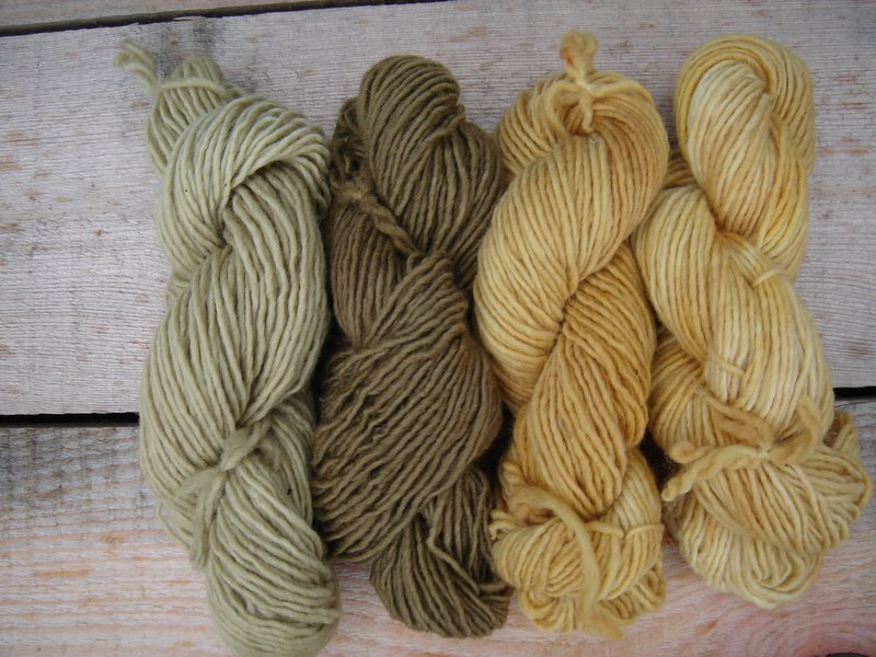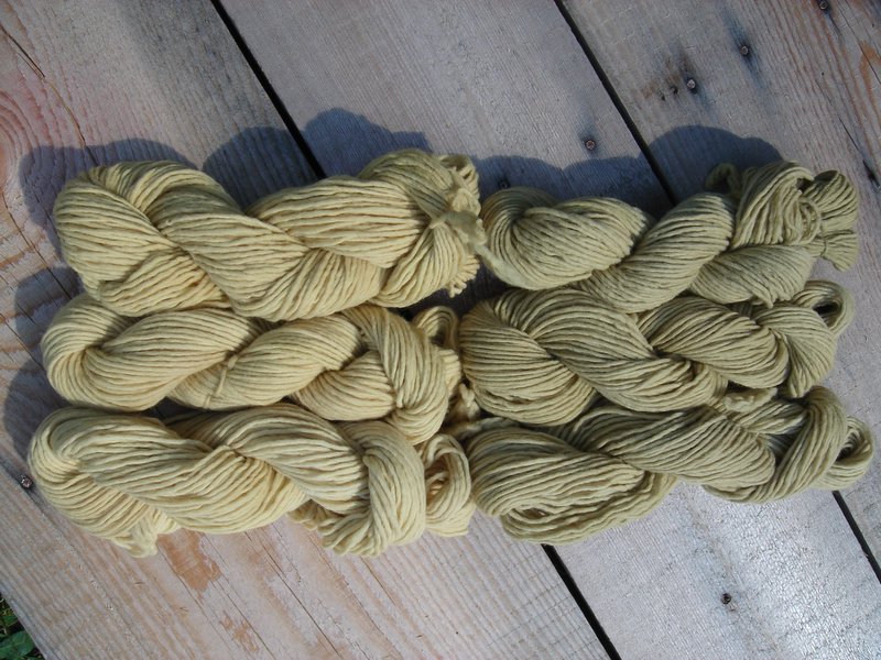 Hier die vier Schattierungen meiner Baumbart- und Flechtenfärbung. Ich hab jetzt vier mal 50 g Wolle in wunderschönen Pflanzenfarben – je zwei Grün- und Gelbtöne! 🙂