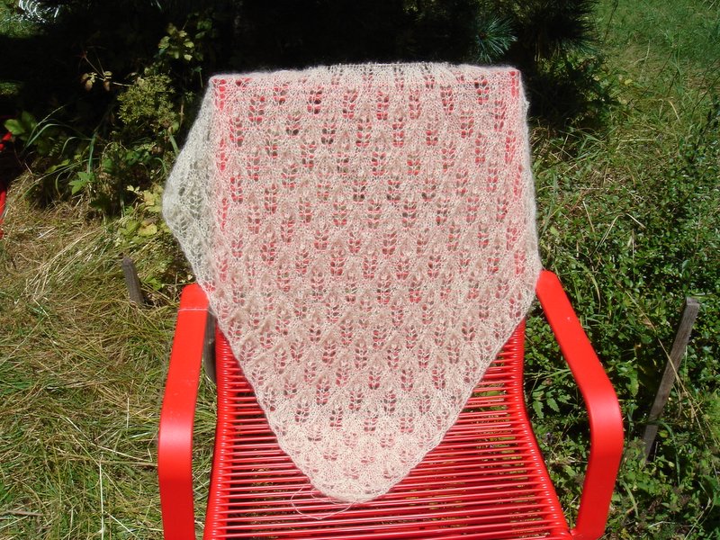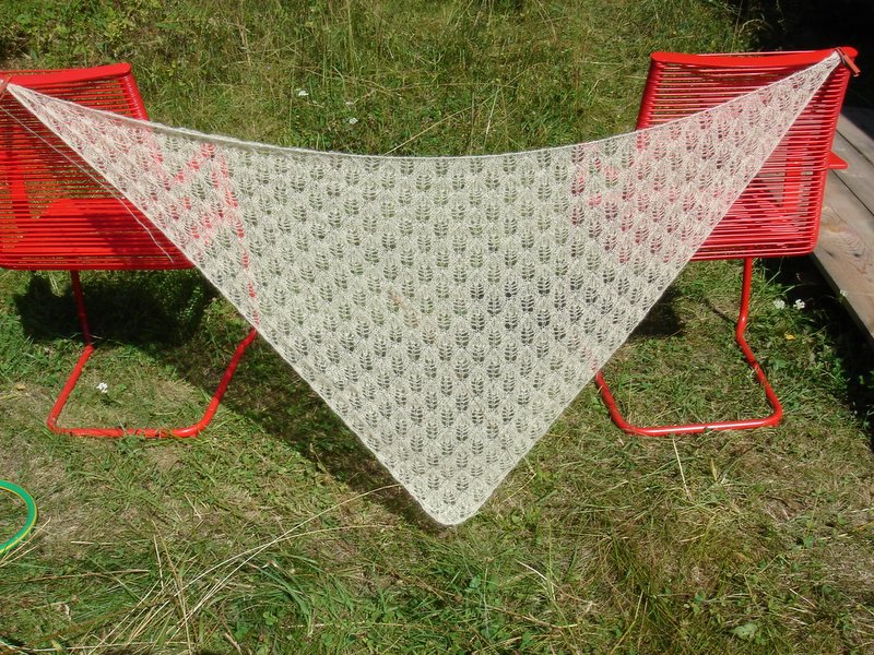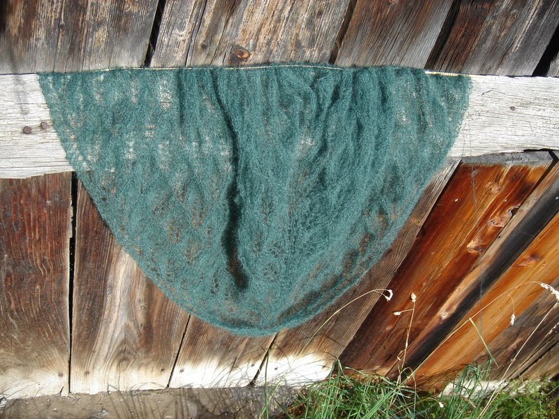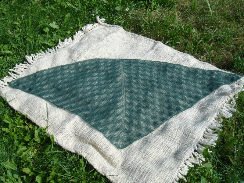 Das Tuch für die Wollprinzessin ist fertig und die gefärbte Wolle vom Heidekraut ist getrocknet. Das Tuch gefällt mir sehr gut, es wiegt 50 g, und ich hoffe, dass sich die Wollprinzessin darüber freuen wird! Mit der Farbe der gefärbten Wolle hab ich mich inzwischen auch schon abgefunden. Eine große Winterdecke braucht viele Gelb- und Grüntöne! Jetzt werde ich mich an einem neuen Tuch versuchen in Grün – ein KIRI!