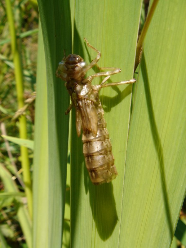 Soeben am Teich entdeckt: Den zurückgelassenen Panzer einer ausgeschlüpften Libelle auf einem Iris-Blatt.