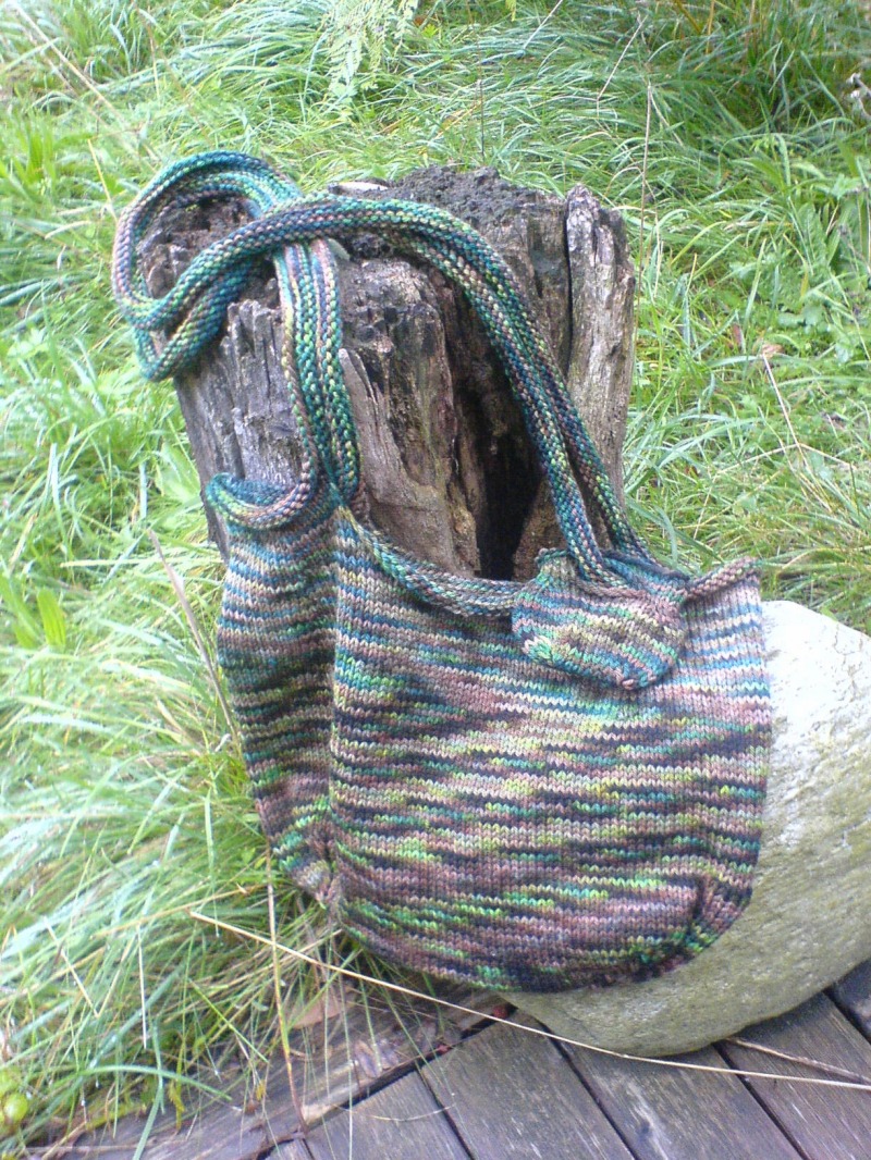 Jetzt ist die Tasche fertig, die ich aus der selbstgefärbten grünbraunen Wolle gestrickt und dann in der Waschmaschine gefilzt habe. Aus derselben Wolle habe ich dann gleich noch Pulswärmer gestrickt. Nebenbei bin ich beim Merino-Wolle und Tussah-Seide Färben mit Walnuss Schalen. Fotos folgen.