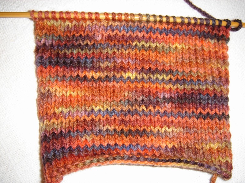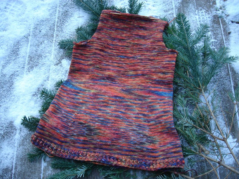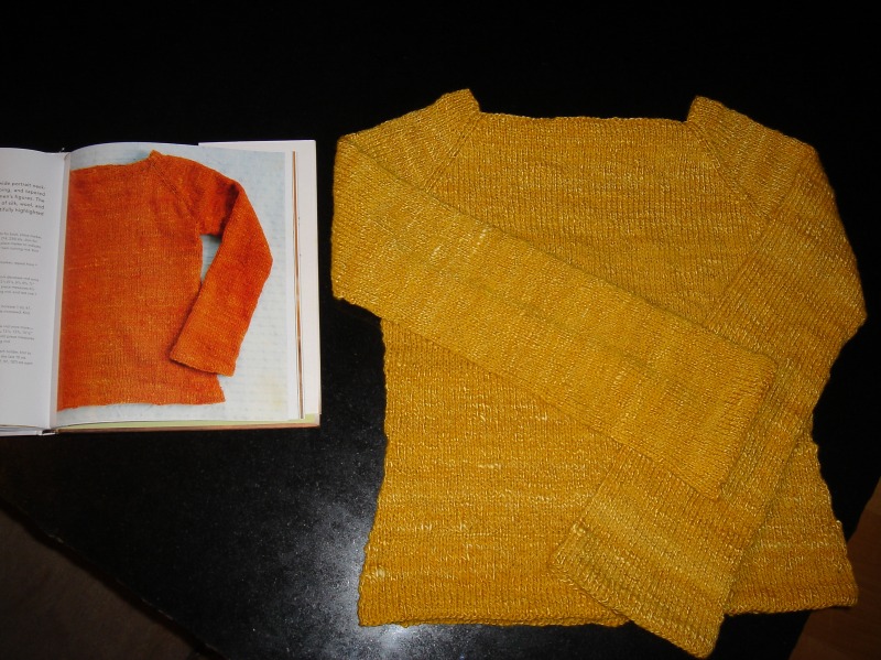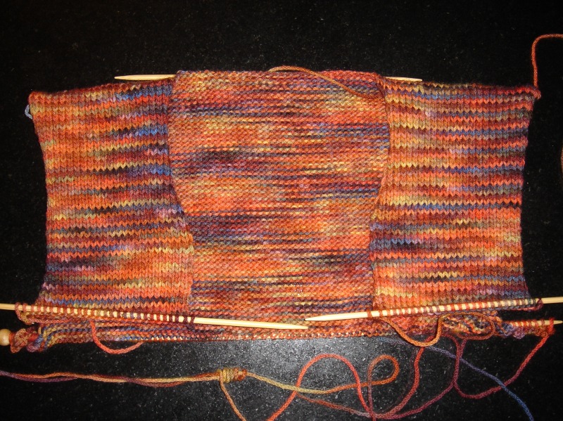 Hier habe ich angefangen, den Pulli „Sahara“ zu stricken, allerdings wird er sicherlich zu klein. Ich werde mir doch lieber eine – von der Maschenprobe her – passende Wolle kaufen, denn der Schnitt ist wirklich genial! Der Pulli hat keine Schulternähte und keine Seitennähte und wird von oben nach unten gestrickt, man kann also immer während des Strickens probieren, ob er passt. Auch die Abnäher kann man genau anpassen.