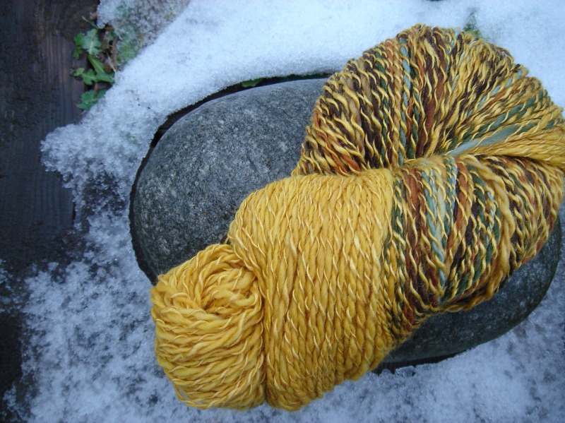 Diese Wolle hab ich vor längerer Zeit bereits gesponnen. Da ich sie jetzt verschenke, stelle ich sie zum Abschied noch in meinen blog. Es ist Merinowolle mit Seide – das Einfärbige ist eine Färbung mit Zwiebelschalen, die bunte Merino (hab ich von Astrid bekommen) war schon gefärbt. Ich finde, dass es gut zusammenpasst. Das Foto hab ich heute gemacht – in unserem Garten liegt schon Schnee.
