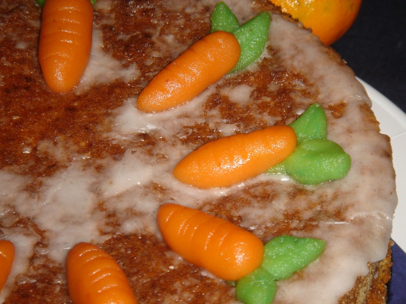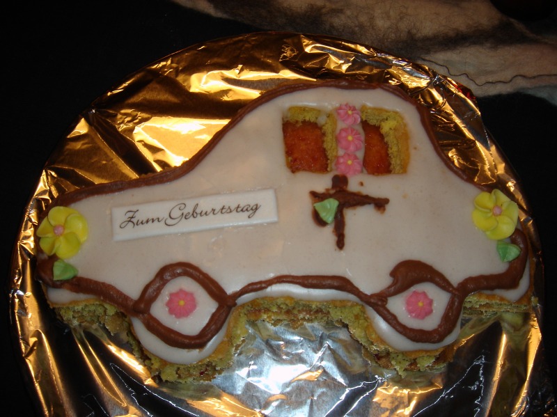 Und hier noch der Kuchen, den mein Kind von seiner Freundin bekommen hat – mit selbst gefärbten und geformten Marzipankarotten: