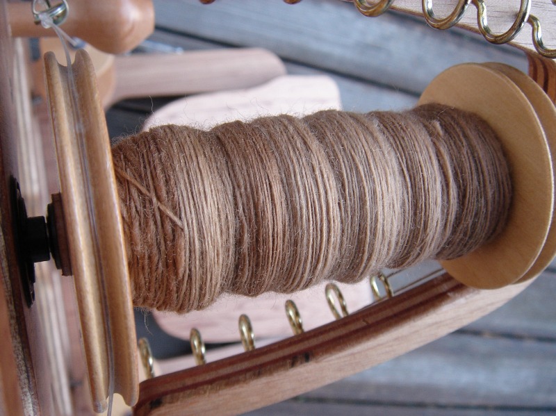 Endlich hab ich mich wieder einmal zum Spinnrad gesetzt und begonnen, die Wolle, die ich mit den Walnussschalen gefärbt habe, zu spinnen.