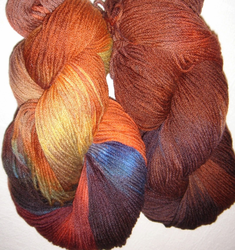 Ich bin dabei, die mit Walnussschalen gefärbte Tussahseide zu verspinnen (Foto später), da brauch ich aber ein bisschen Abwechslung, weshalb ich jetzt einmal meine handgefärbte Wolle zum Knäuel wickle, damit ich mir besser überlegen kann, was ich daraus stricken könnte (Foto hier):