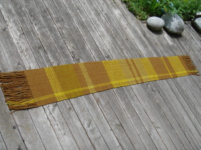 Hier habe ich meine mit roten Zwiebelschalen gefärbte Wolle zu einem Schal (eigener Entwurf) verwoben. Er ist 192 cm lang (ohne Fransen) und 27 cm breit.