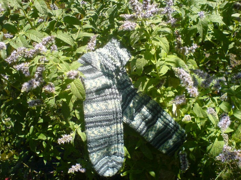 Jetzt sind die Besuchersocken in Größe 39 fertig. Wolle: Lana Grossa meilenweit meeting. Anschlag: 60 Maschen. Weiß vielleicht jemand, was das für ein Gewürzpflanze ist, auf der ich die Socken fotografiert habe? Sie wuchert in unserem Garten. Leider kann ich es vom Geruch her nicht zuordnen.