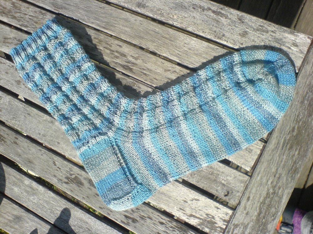 Da die Socken Größe 45 sind, ist erst einer davon fertig. Garn: Lana Grossa meilenweit Cotton Spirit, Anschlag: 68 Maschen, Nadeln Nr. 2,5