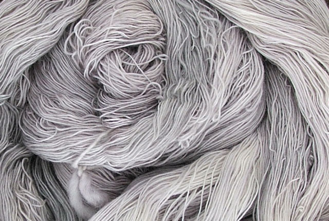 Für den secret of chrysopolis Schal hab ich mir jetzt noch eine andere Wolle – malabrigo – bestellt, handgefärbt, superweich, in grau / lila, LL: 430 m für 50 g, 100% baby merino.