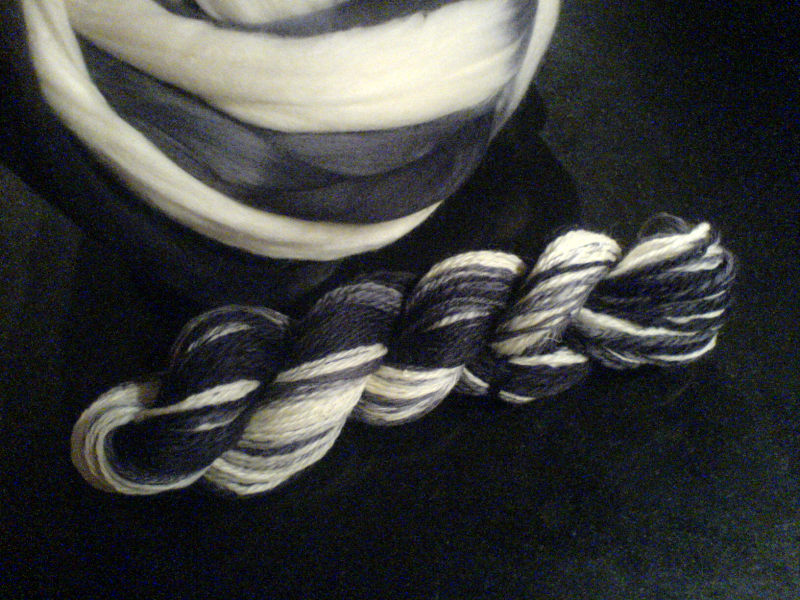 Diese Wolle habe ich versponnen und dann navajo gezwirnt, damit der Farbverlauf erhalten bleibt.