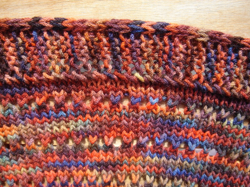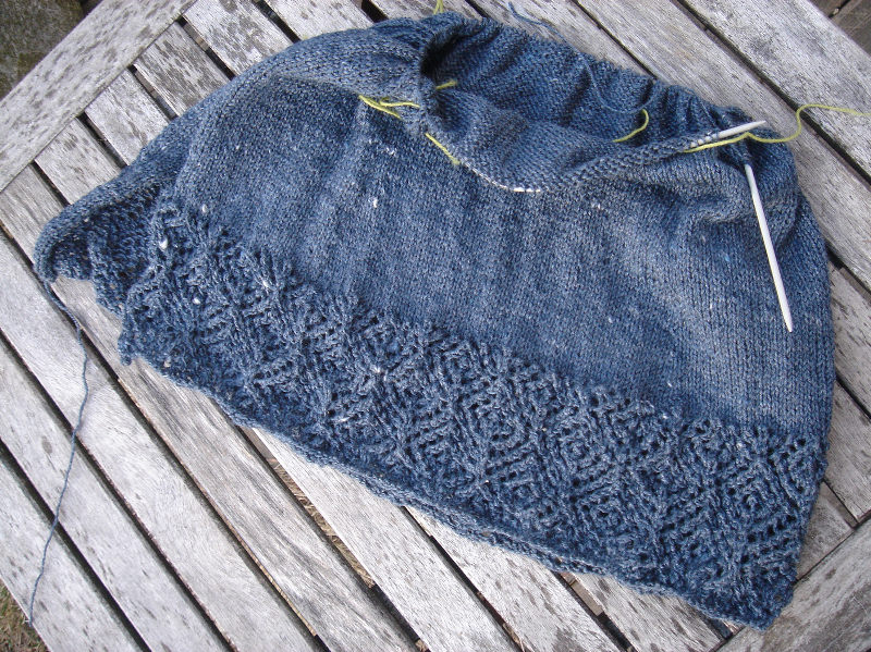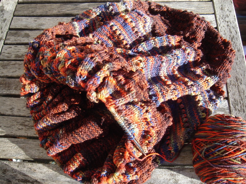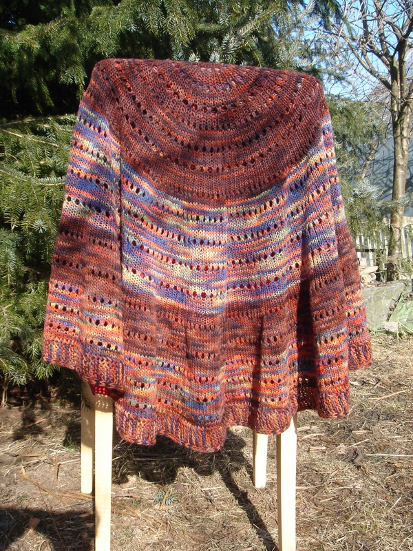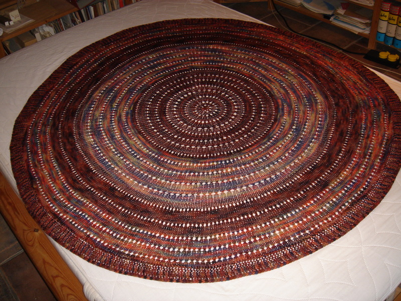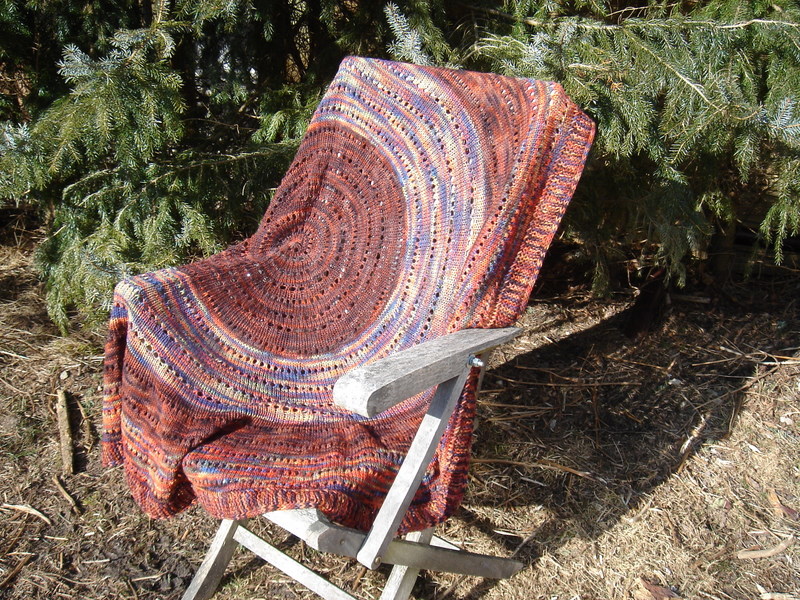 von Elizabeth Zimmermann ist fertig. Er gefällt mir sehr. Ich hab ihn aus 100% Wolle – selbstgefärbt – gestrickt. Der Durchmesser ist 150 cm.