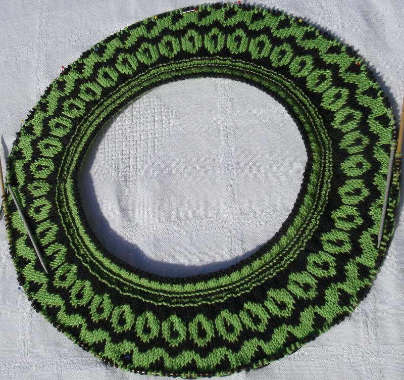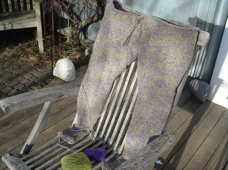 Der nächste Winter kommt bestimmt! Also bin ich dabei, mir aus Elizabeth Zimmermann’s knitter’s almanac eine warme Hose zum Herumlungern auf der Couch zu stricken! Ich verwende zwei Garne zusammen: Rowanspun dk (grün) und rowanspun 4 ply (lila) – die hatte ich grad noch übrig. Und um Kritikerinnen von vornherein mundtot zu machen: Die Hose zieh ich wirklich NUR dann an, wenn ich GANZ alleine bin! Versprochen! Und es gibt auch ganz sicher KEIN Foto am Modell. Auch versprochen! Aber ein Foto von der fertigen Hose kommt dann noch.