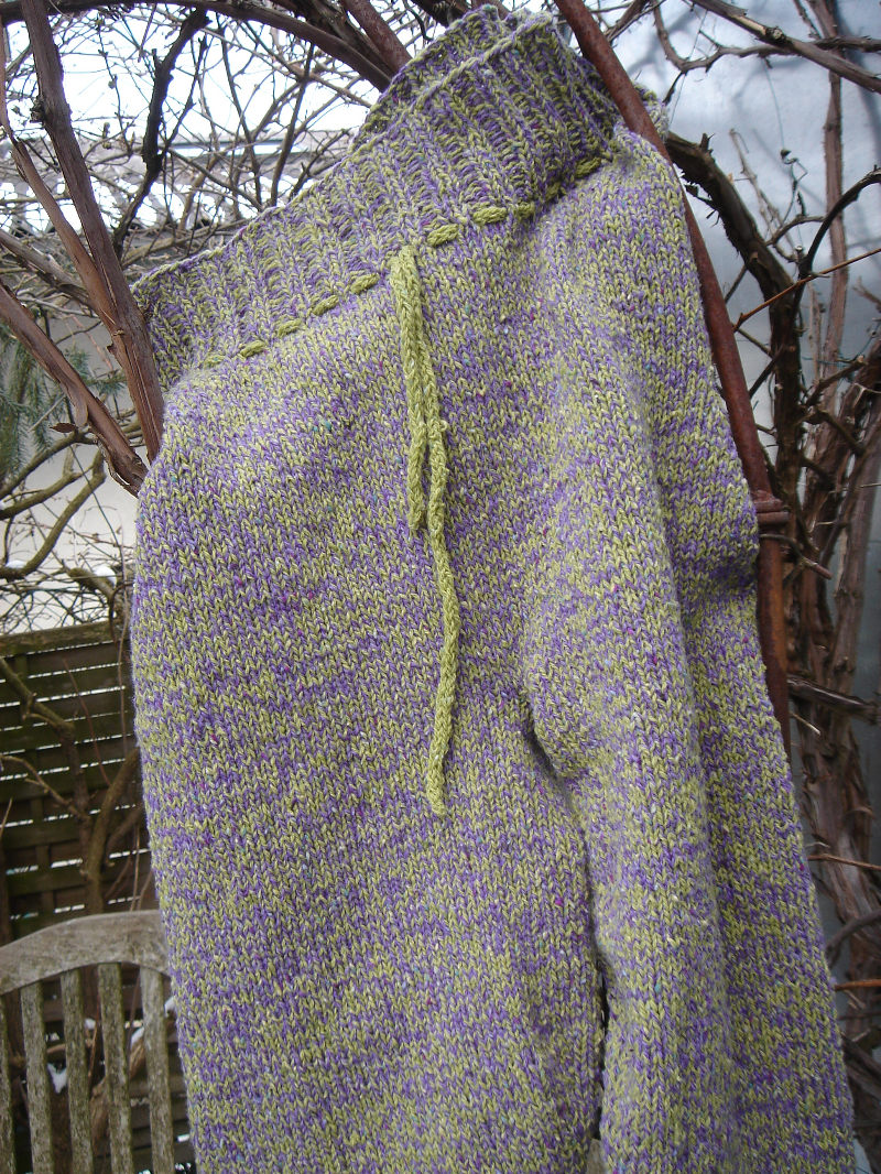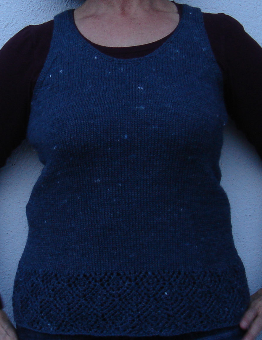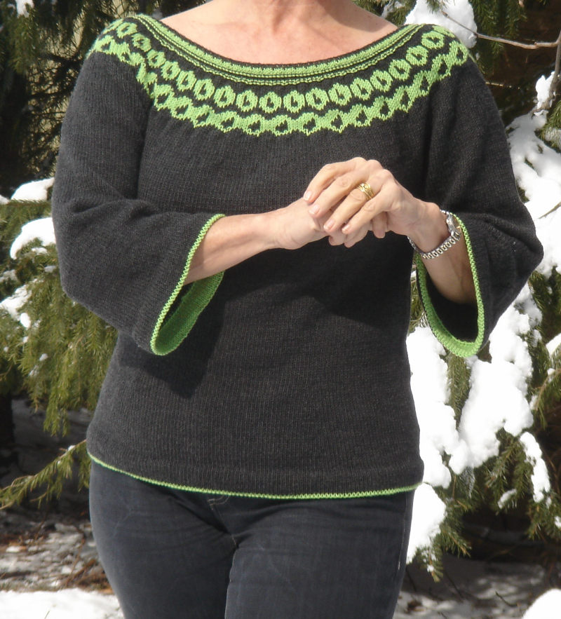 ist fertig und ich liebe es! Den unteren Musterstreifen hab ich nach der Anleitung „drawstring chemise“ aus der interweave knits gestrickt, alles andere hab ich nach meinen Maßen und Vorstellungen gestrickt. Es passt sehr gut und es gefällt mir. Die Bambus-Seide-Wolle fühlt sich auch sehr gut an und ist ganz angenehm zu tragen.