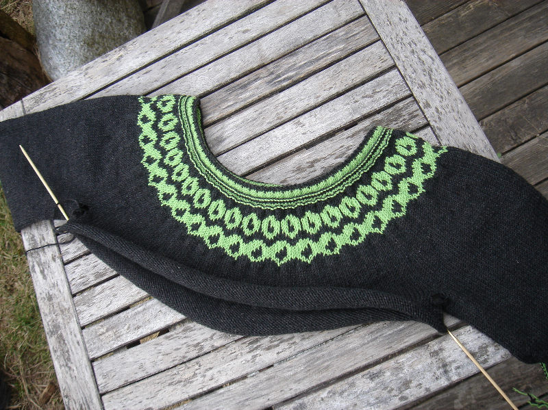 von oben nach unten zu stricken und hoffe, dass es mir gelingen wird. Mit der Maschenprobe komm ich leider gar nicht hin – also muss ich selbst rechnen. Bis jetzt geht’s noch recht gut, ich bin zufrieden mit dem bisherigen Ergebnis – aber wie soll das jetzt mit den Ärmeln funktionieren? Da bin ich einfach nur gespannt.