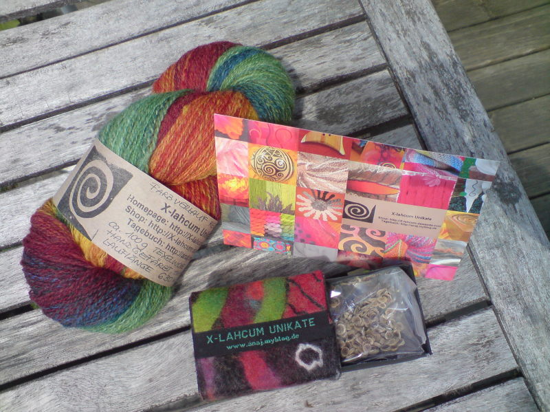 Hier möchte ich den Inhalt des Päckchens zeigen, das mir Jana zu meiner großen Überraschung geschickt hat. Neben einer ganz lieben Karte hat sie eine kleine Schachtel mit Filz bezogen, in der sich Samen für schwarze Stockrosen befinden. Das ist ein ganz besonderer Schatz für Färberinnen – denn man kann mit den Blüten sehr gut Wolle färben. Außerdem sehen sie wunderschön aus und passen zu einem alten Bauernhof. Und dann hab ich noch einen wunderschönen, von Jana handgefärbten, handgesponnenen Wollstrang geschenkt bekommen – Farbverlauf: Regenbogen. Ich vermute jetzt einmal, dass ich damit ein Tuch stricken werde. Die Idee muss allerdings erst noch so richtig gut ausgebrütet werden. Vielen Dank, liebe Jana – du weißt, wie sehr ich mich gefreut habe.