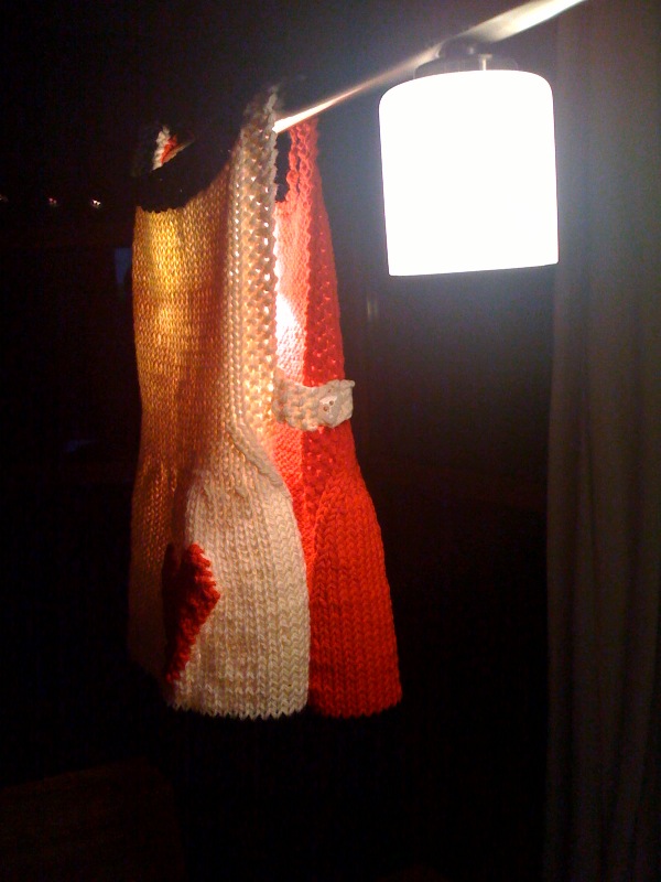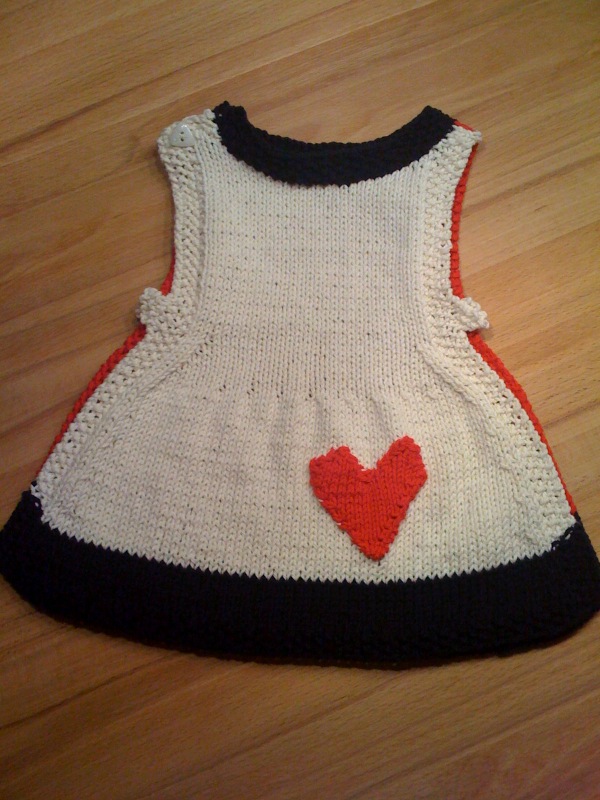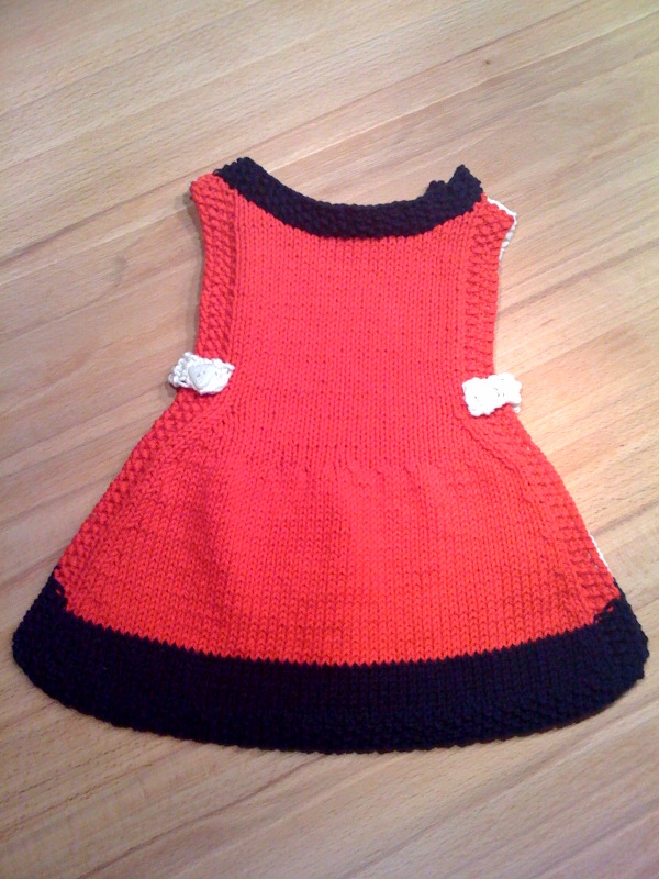 Falls mein Enkelkind ein Mädchen werden sollte, hab ich vorsichtshalber schon einmal eine Baumwolltunika gestrickt. Die Anleitung ist hier zu finden.Verwendetes Material: Pantino von Schoeller Esslinger. Man kann sowohl die weiße als auch die rote Seite als Vorderseite verwenden. Seitlich ist das Kleid offen und wird nur von den beiden Bändern zusammengehalten.