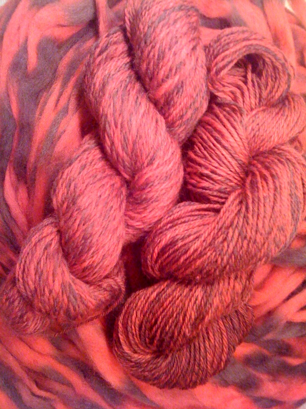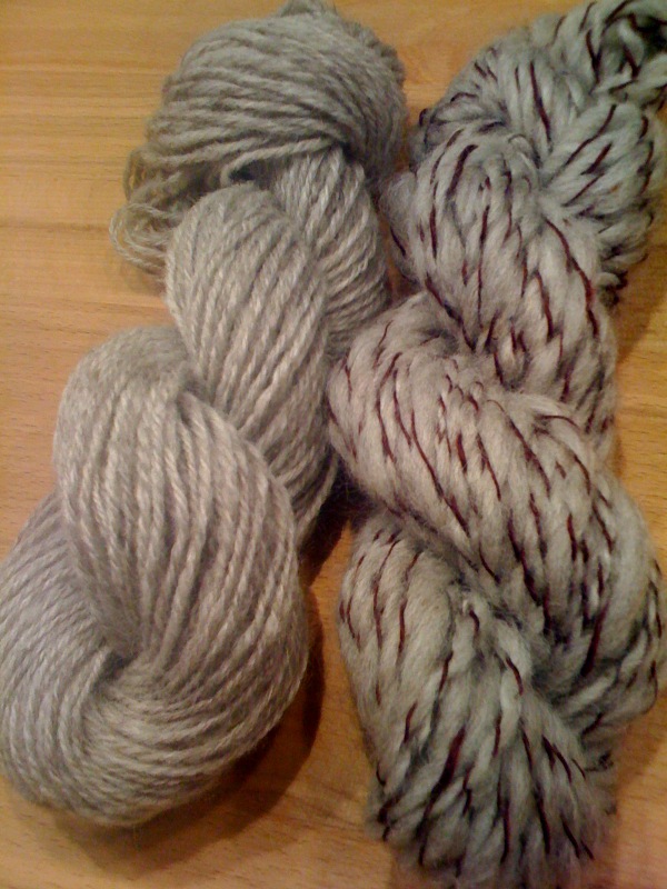 Ich habe Corriedale Wolle versponnen – auf ganz unterschiedliche Art, einmal recht dünn versponnen und dann navajo gezwirnt, ein weiteres Mal hab ich die gleiche Wolle zu einem ziemlich dicken Faden gesponnen und im Anschluss mit einem ziemlich dünn gesponnenen Merinofaden verzwirnt.![]()