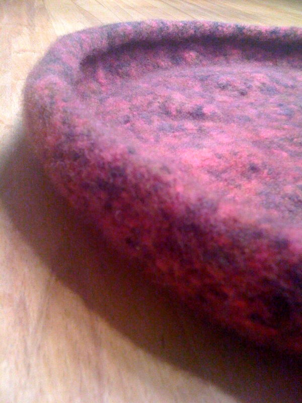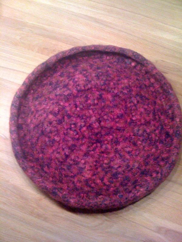 Hier hab ich ein Katzenbett für einen großen Kater gestrickt und anschließend in der Waschmaschine gefilzt.