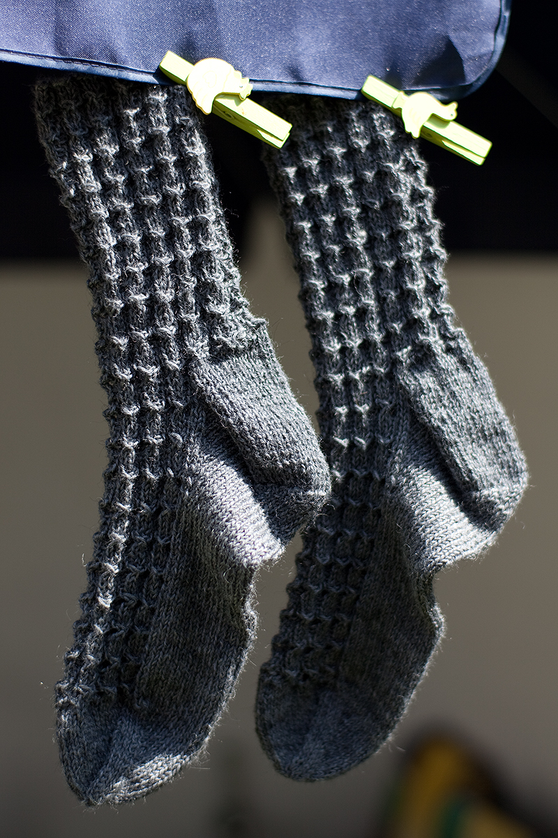 Zur Abwechslung wieder einmal ein Sockenfoto gefällig? Das eine Foto draußen im Schnee, das andere im Zimmer – die wirkliche Farbe liegt irgendwo dazwischen.