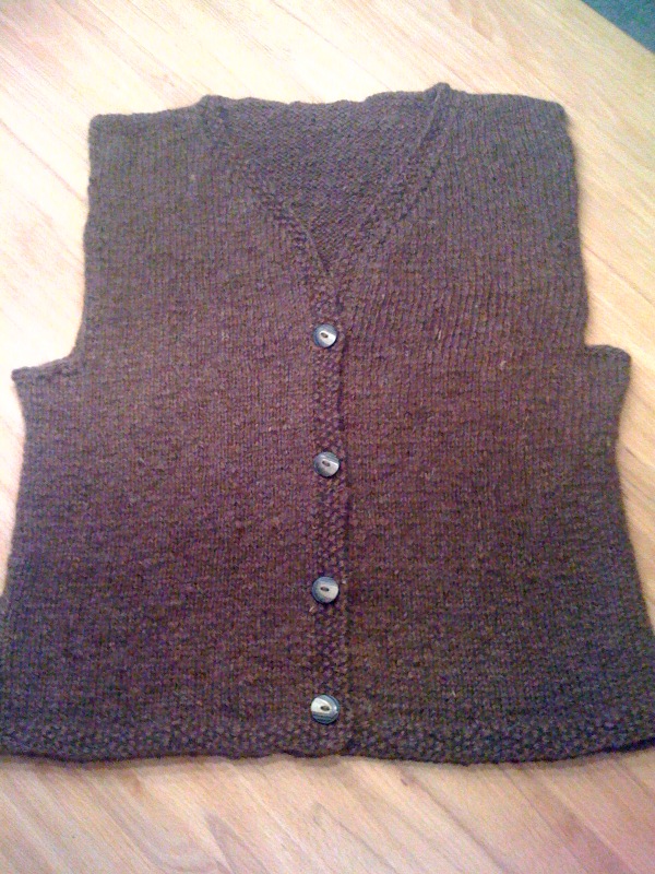 Mein Mann hat sich eine Weste aus handgesponnener Bergschafwolle (ungefärbt von braunen Schafen) gewünscht. Heute ist sie fertig geworden – so ganz ohne Anleitung.