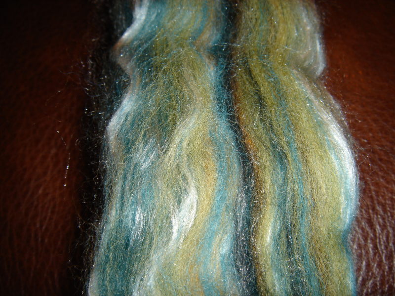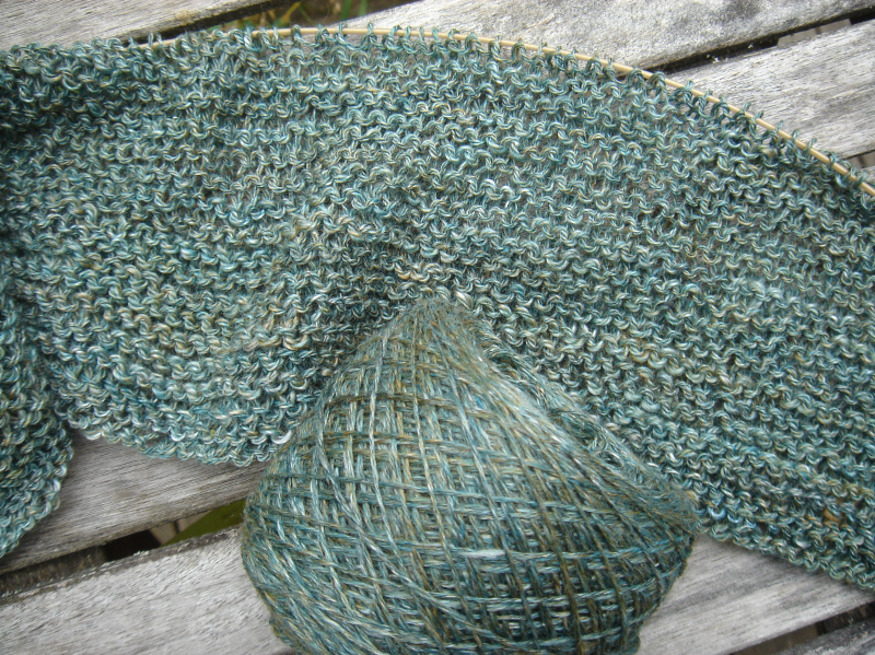 Heute habe ich mit einem ganz einfachen Tuch begonnen. Das Garn habe ich aus diesem Merino-Seidengemisch gesponnen und dreifach gezwirnt (navajo).