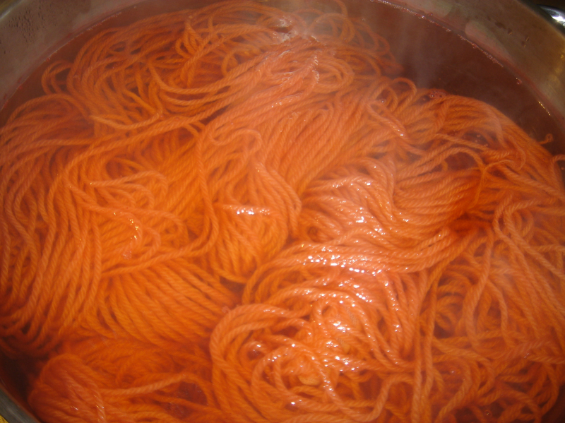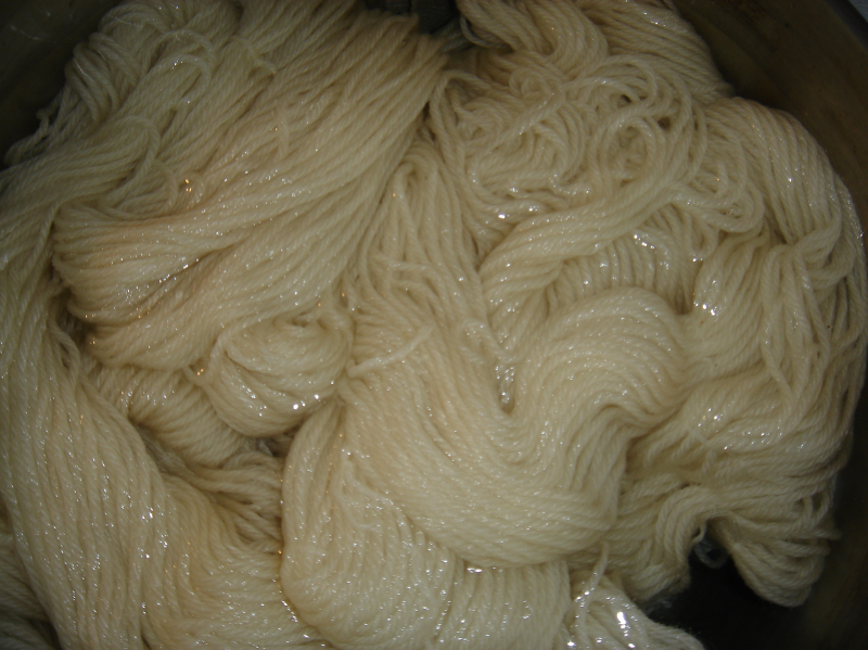 Zuerst habe ich die Wolle 1 Stunde lang in Wasser mit Alaun gebeizt.