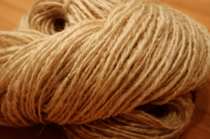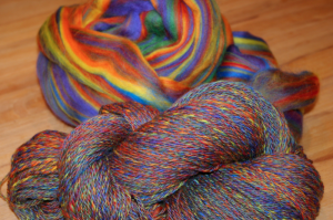 habe ich diese Wolle. Ich weiß nicht mehr, welchen Ursprungs die ist, sie hat jedenfalls sehr stark gehaart beim Spinnen und fühlt sich ziemlich kratzig an. Immerhin ist sie schön zum Anschauen.