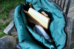 Was ist in der Tasche? Sieht ganz nach einem Spinnrad aus!