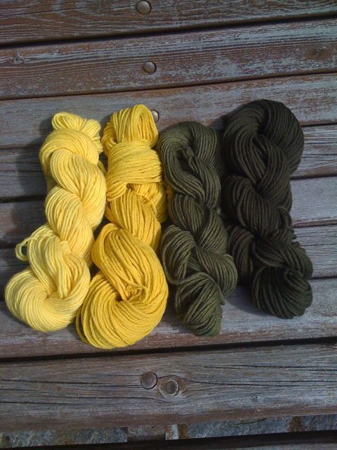 Ich habe die Wolle mit Alaun gebeizt, anschließend mit Rainfarn gelb gefärbt und dann mit Eisenwasser zu grün weiterentwickelt. Der jeweils hellere Strang stammt aus dem 2. Zug.