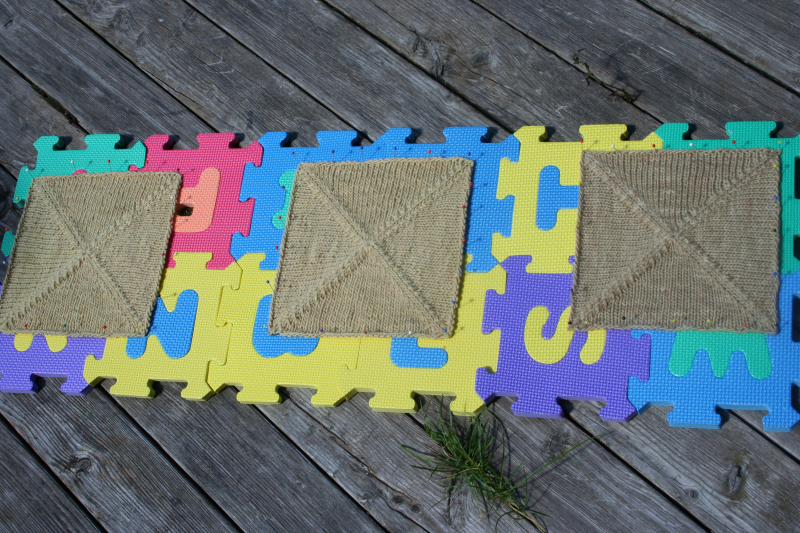 Ich habe die ersten Quadrate für meine pflanzengefärbte Decke bereits gewaschen und gespannt: