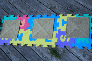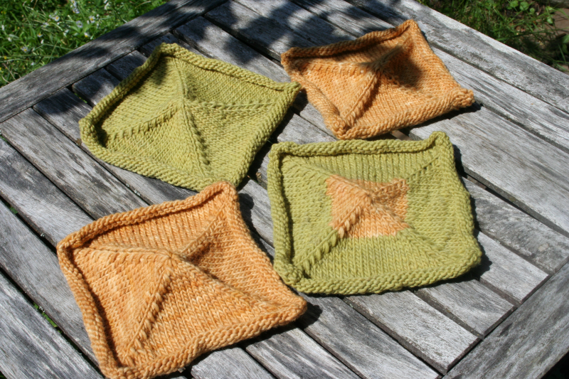 Diese Quadrate warten noch auf die Wäsche. Die orangefarbenen habe ich mit Baumbart gefärbt, das Grün kommt von der roten Haselnuss.