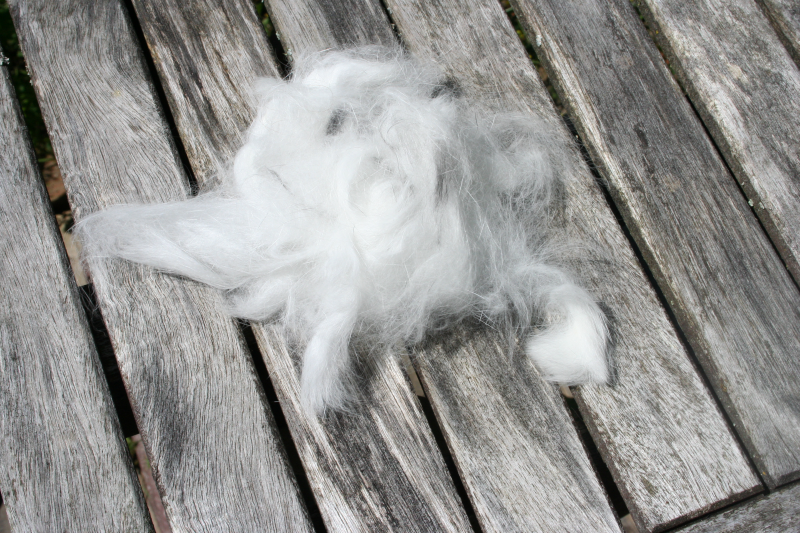 Und jetzt versuche ich diese Wolle zu verspinnen, die mir mein Bruder gestern gegeben hat. Sein Kaninchen wechselt das Fell.