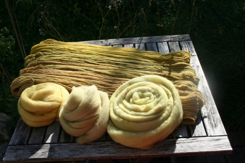 Mit Alaun gebeizt, habe ich Wolle – teilweise schon vorgefärbt mit anderen Pflanzen wie Erika oder Rainfarn – und Kammzüge gefärbt. Es sind Gelb-, Grün- und Brauntöne entstanden. Ich bin ganz zufrieden damit.