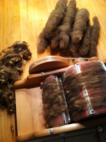 im Einsatz. Morgen abends bin ich beim Spinntreffen, deshalb habe ich heute noch Wolle kardiert.