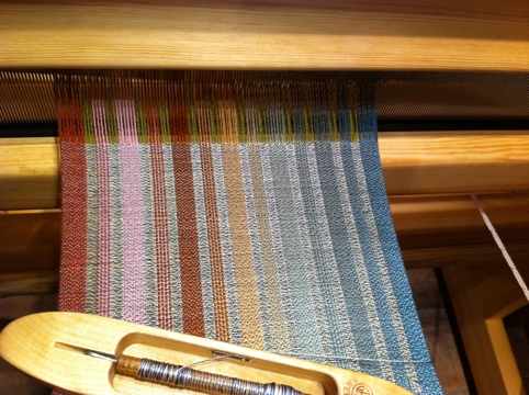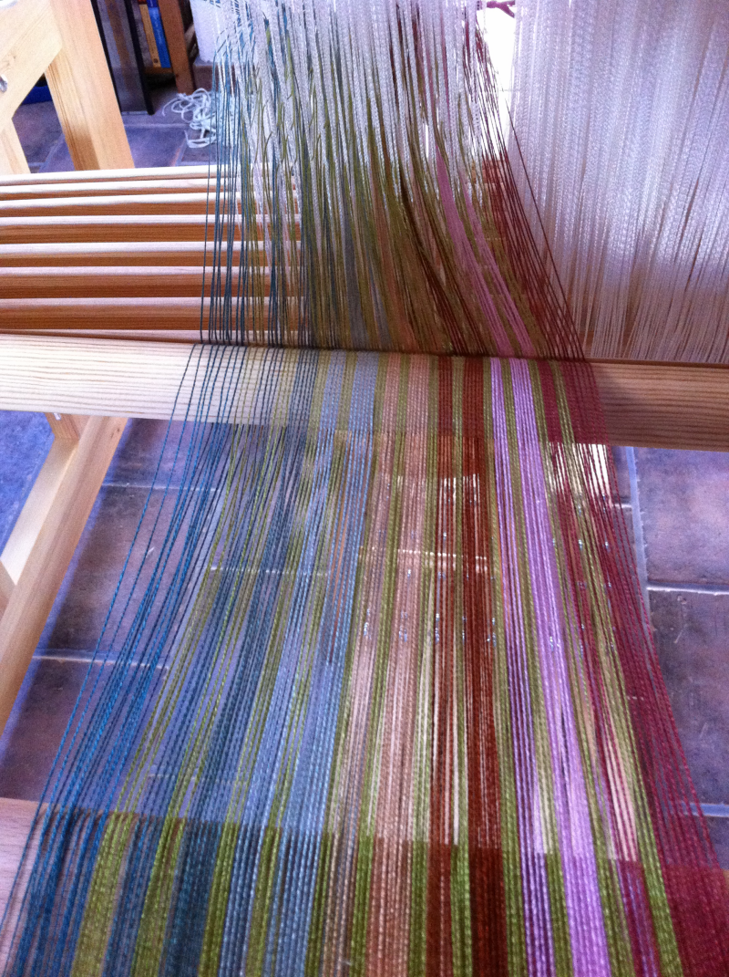 Die Kette ist fertig, acht Schäfte sind bestückt, der Schal ist angewoben.