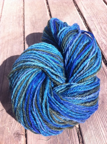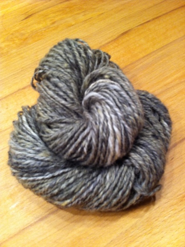 Ich habe verschiedene Fasern zusammenkardiert (Merino, Alpaka, Gotland) und dann versponnen: