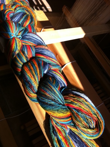 Aus dem Lace Zauberball von Schoppel (LL: 800m/100g) hab ich eine Kette geschärt. Als Schuss möchte ich das Single Garn verwenden, das ich neulich gesponnen habe. Da es überdreht ist, müsste sich der Stoff dann etwas zusammenziehen. Normalerweise macht man zuerst ein Muster, aber ich lass mich überraschen. Sehr spannend!!!