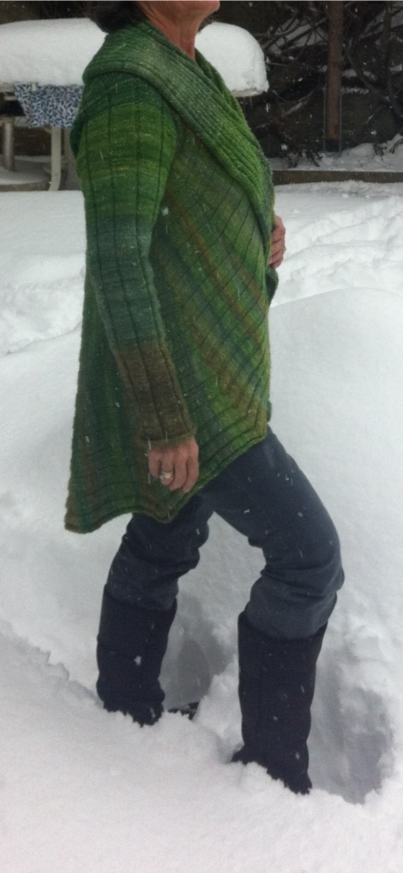 Nun ist sie endlich fertig, meine Wasserwirbeljacke. Die Wolle habe ich gesponnen, bei Melanie habe ich die Kammzüge gekauft. Sie musste zweimal nachfärben, weil ich immer zu wenig bestellt habe. Die Jacke, die beinahe ein Mantel geworden ist, wiegt 1200g. Das Waschen in der Waschmaschine hat sie übrigens ganz ausgezeichnet überstanden.