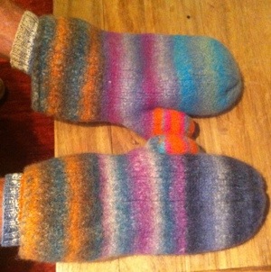 Regen und Kälte draußen, drinnen ein kleines Feuerchen im Ofen, eine Tasse Tee am Tisch, im Fernsehen ein Fußballspiel – kann man da was anderes stricken als Fäustlinge, die dann gefilzt werden?