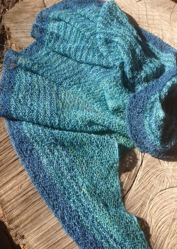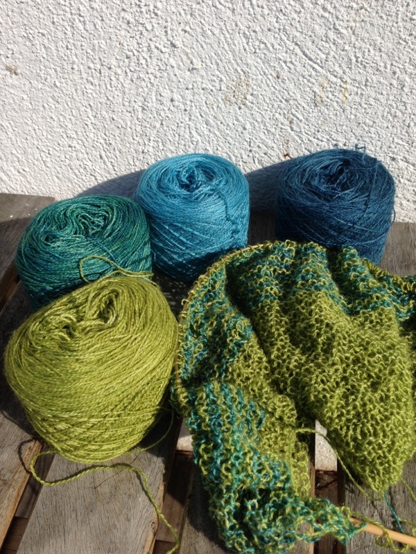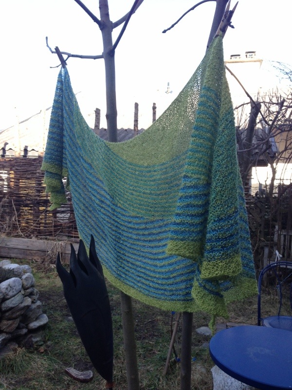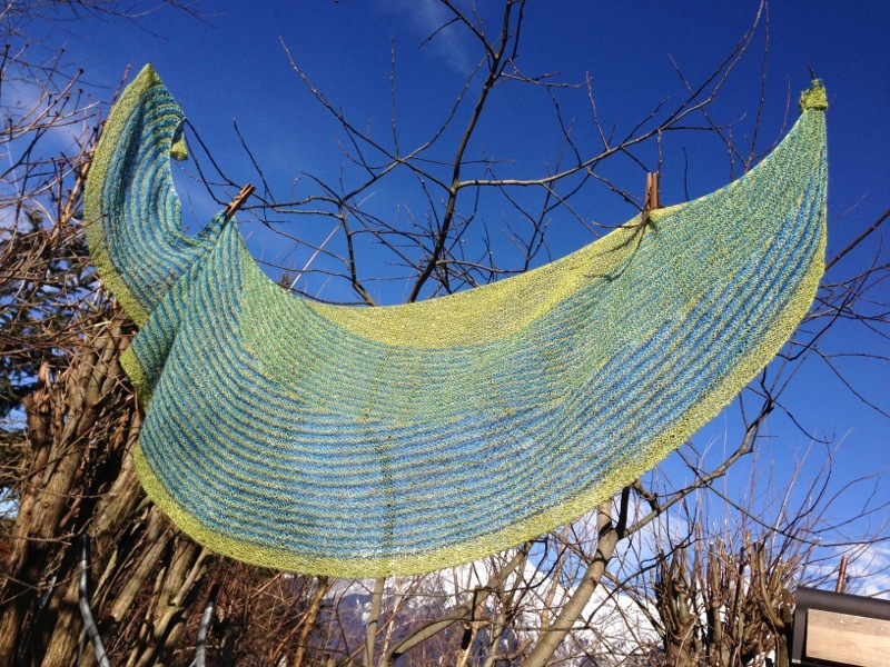 Mit der zweiten Hälfte der Stränge habe ich jetzt noch einen zweites Tuch gestrickt. Es ist leicht wie eine Feder – 80 Gramm – und kuschelig weich.