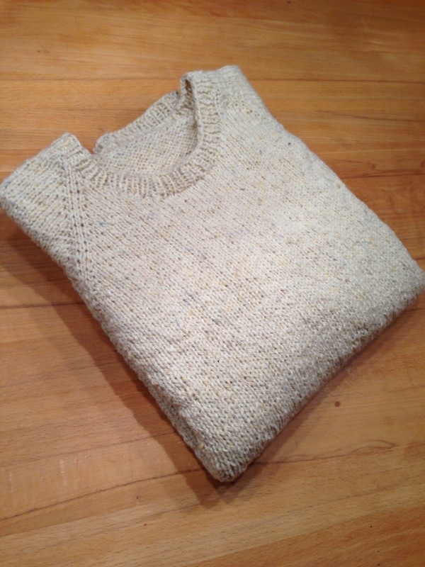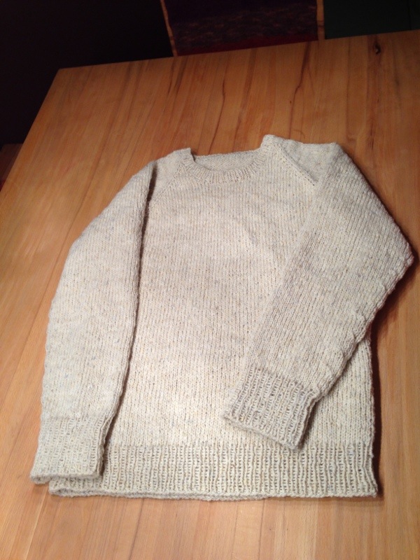 Ich hab mir in Irland irische Wolle von Studio Donegal gekauft und damit einen klassischen Raglanpulli nach dieser Anleitung gestrickt.