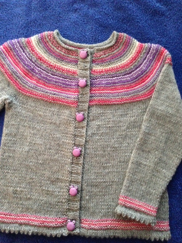 Eine meiner Enkelinnen hat sich eine von mir gestrickte Jacke gewünscht. Sie hat sich dieses Modell ausgesucht, das ich in recht kurzer Zeit gestrickt habe, weil sie ja schon übermorgen auf Osterbesuch kommt!