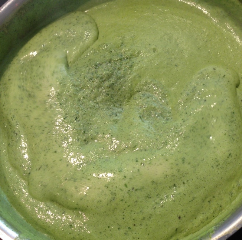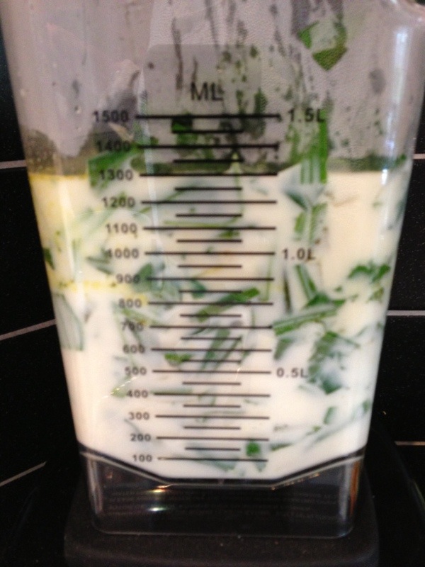 Die angedünsteten Kräuter in den Mixer geben – zu einem Gemisch aus Gemüsebrühe und Milch (1:1).