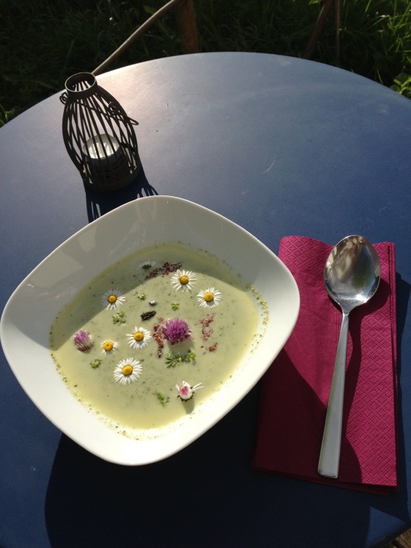 Zum Schluss nach Belieben mit etwas geriebenem Parmesan und Rahm verfeinern und mit Blüten von Spitzwegerich, Gänseblümchen, Sauerampfer, Frauenmantel und Schnittlauch dekorieren.
