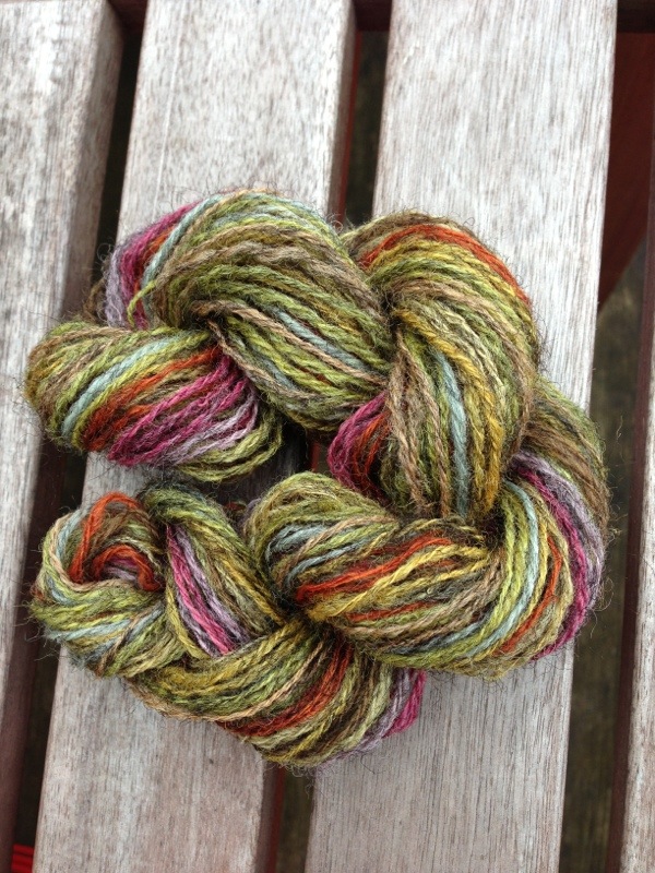 Jetzt habe ich die einzelnen Proben zu einem kleinen Strang versponnen. Ich finde, er sieht hübsch aus.