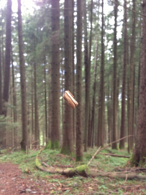 Dieses Stück Holz hängt am Faden einer Spinne – heute entdeckt bei einer Wanderung.
