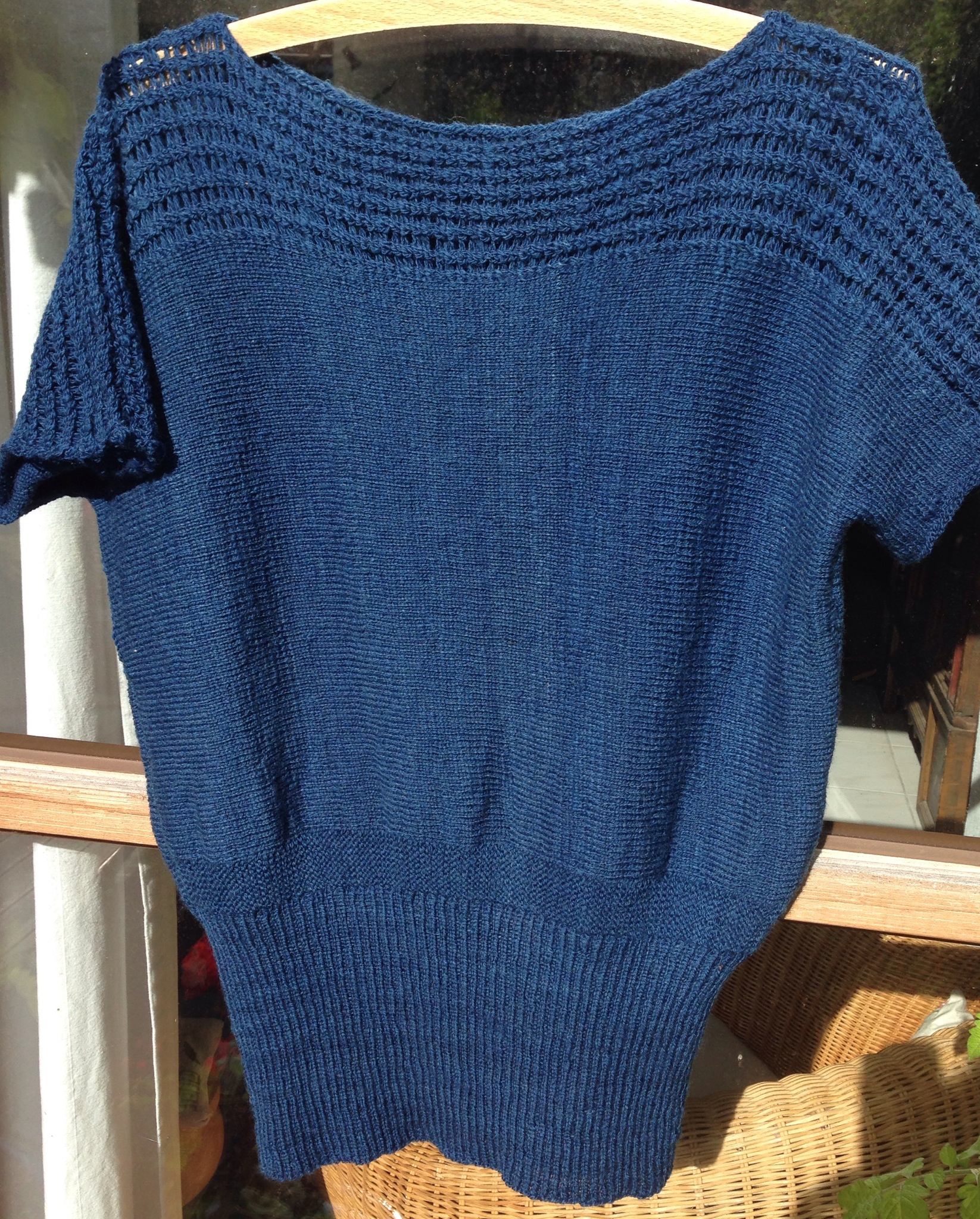 Einen indigogefärbten Merinokammzug habe ich ziemlich dünn gesponnen, zweifach gezwirnt und mit Nadeln Nr. 3,5 zu diesem Pulli verstrickt.