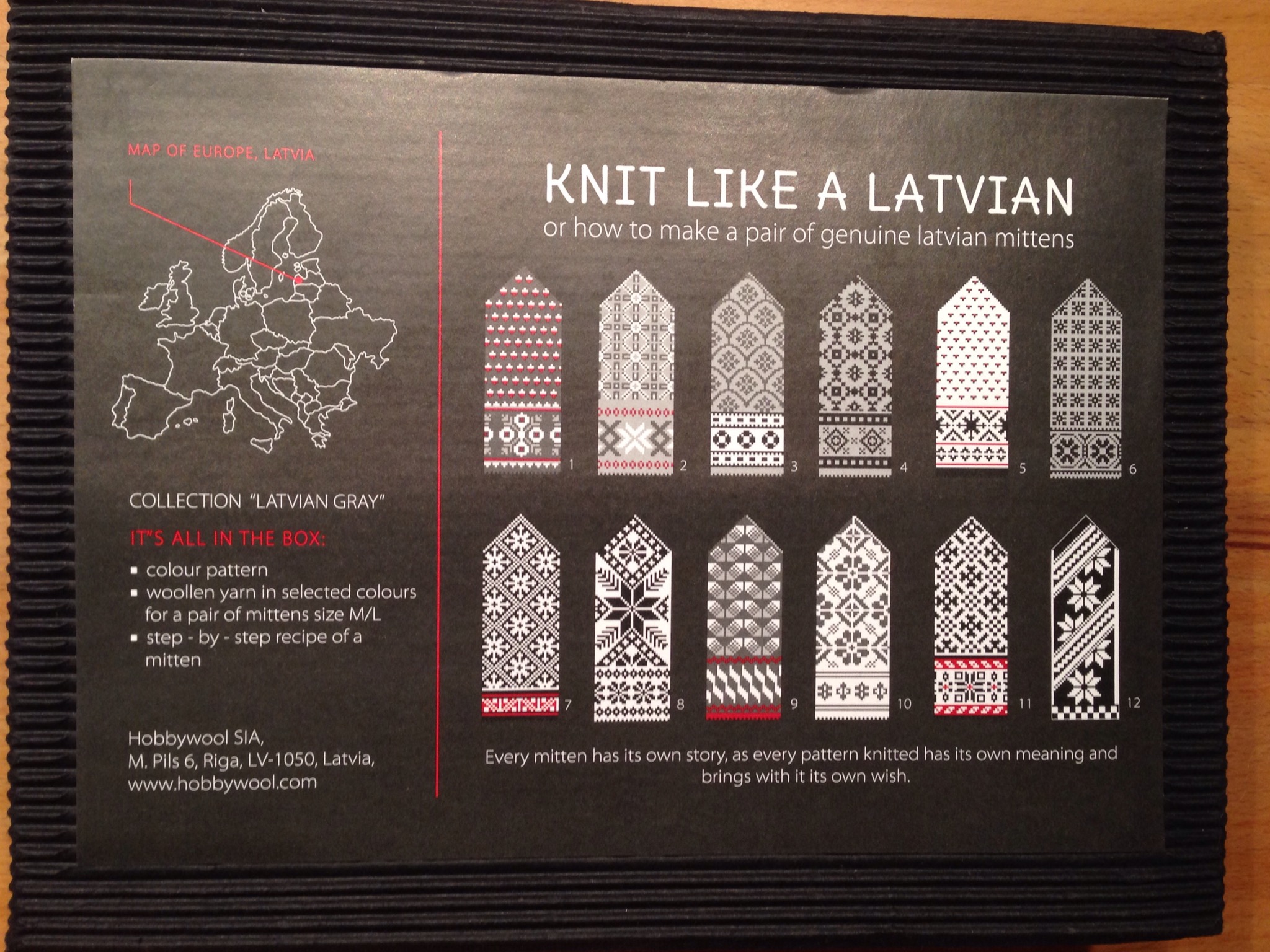 Es ist eine Zusammenstellung von Wolle aus Lettland, die man für ein paar Handschuhe braucht. Das Handschuhmodell kann man aus 10 verschiedenen Vorschlägen auswählen. Das Paket wird dann individuell zusammengestellt. Ich habe mir aus der unteren Reihe das äußerst linke Paar mit den Schneeflocken ausgesucht.